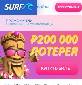 На главной странице отображаются самые популярные игры Surf, размер общего джекпота и условия программы лояльности.